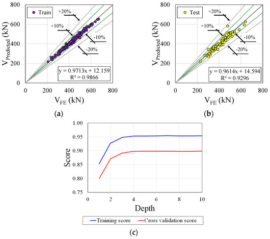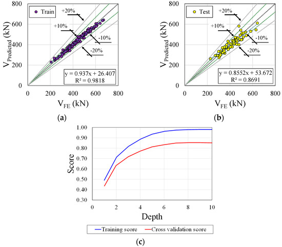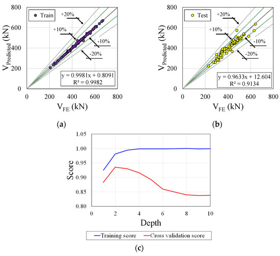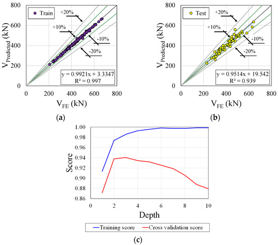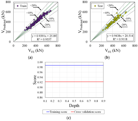Figure 14. Random forest regressor performance. (a) Train; (b) test; (c) validation curve.
