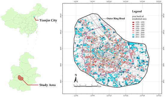 In recent years, cases of multi-party governance in older communities that are very similar to BID have been spontaneously formed in southern China’s megacities, such as Chengdu, Suzhou, and Shanghai, which have more active market economies and private-driven forces for urban regeneration. These practices may be called business and residential alliance [47] or community governance alliances [48], but they do not have a unified name currently. Research shows that the performances of these cases are uneven, the majority of failed cases are due to the lack of public power support and mandatory constraints that the BID model possesses, making it difficult for participants to reach a cooperative consensus on community regeneration and achieve long-term sustainable operation [47,49]. Tianjin, which is one of the 21 megacities where the urban permanent population of more than 10 million as defined by the State Council of China, second only to Beijing among northern cities in terms of population, economy, and urban scale, went through earlier than the aforementioned southern cities of the rapid industrialization, urbanization, and industrial population aggregation from the 1970s to the early 21st century [50]. Therefore, Tianjin is the representative city in China, facing the most significant demand for urban industrial transformation and the largest number of old residential areas built in an era before the end of 2000 where quality was neglected. In other words, the severe challenges in the decline of Tianjin’s central urban area give prominence to the significance of the BID intervention discussion. This paper takes the central urban area of Tianjin as the study area (bounded by the outer ring road, with a total area of 286 square kilometers), to conduct data collection and analysis (Figure 1).