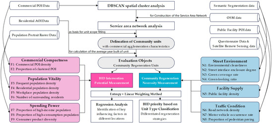 The methodological framework is shown in Figure 2. The DBSCAN analysis and the clustering service area analysis are the preliminary research for BID priority intervention evaluation. In this process, the spatial clustering result matrix is constructed by taking different values of the two key parameters of the minimum number of elements (N) and search distance (D). Then the community regeneration units are delimited through service area analysis with the year built attributes of the neighborhoods. After that, the index system is constructed from the aspects of BID intervention potential and community regeneration necessity and calculates the scores. Finally, the BID intervention priority level of community regeneration units was classified by mathematical statistics. Combining the correlation analysis and spatial location characteristics, the main factors affecting the BID intervention potential of community regeneration units were also explained.