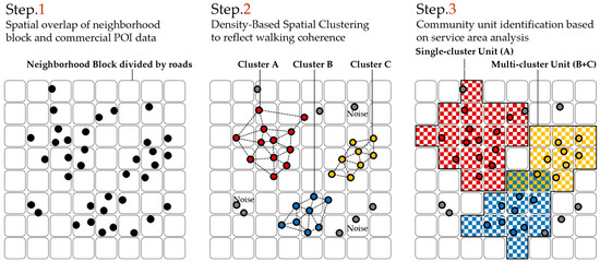 Then proceed to the next step after obtaining the optimal result of DBSCAN analysis. This study uses the road traffic network data set constructed from Open Street Map (OSM) data as the basis for service area network analysis. The road classification involved in constructing the road traffic network data set refers to the four-level urban roads such as expressways, main roads, secondary roads, and branch roads in the “Project code for urban road and transportation engineering” [51], and the pedestrian paths such as sidewalk roads, bicycle paths, and internal roads were included in the study. Different from previous studies that ignored road complexity and traffic light factors that hindered walking ability, this study included the impact of road intersections when assigning walking speeds on these roads. The study found that the average walking speed on auxiliary roads of urban expressway, urban main roads, and urban secondary roads is 50 m/min; the average walking speed on urban branch roads is 70 m/min; and the average walking speed on sidewalks and bicycle lanes without traffic lights is 80 m/min [52,53]. Then, excluding non-walkable roads such as highways and main roads of the Expressway, the walking speed assignment of each road section and the road traffic network data in the central urban area of Tianjin are completed. Through analysis, the main service areas of each commercial cluster within a 10 min walking radius are obtained. Finally, by combining commercial continuity (to determine a single cluster unit or multi-cluster unit) and road network data, it fits the boundaries of community regeneration units based on business district services to establish a BID. The operation flow for identifying community units with commercial agglomeration characteristics is shown in Figure 3.