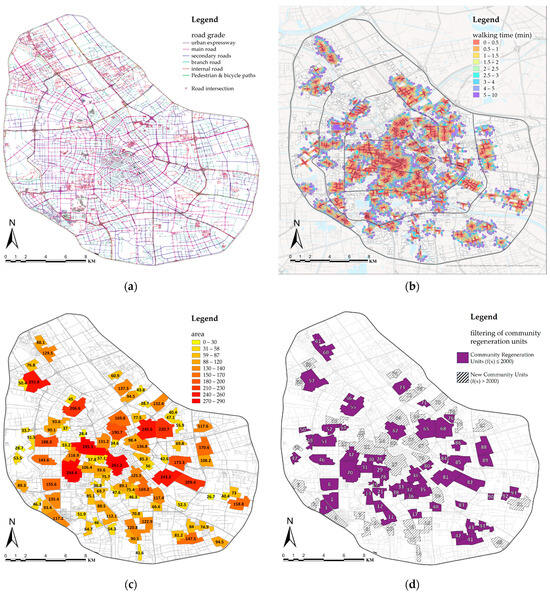 After the calculation of the average year built of 93 community units, the 57 selected community regeneration units as the objects for further measurement and evaluation are shown in Figure 4d. The commonality of these obtained 57 community regeneration units is that they have both the characteristics of commercial agglomeration and relatively low internal living environment quality.