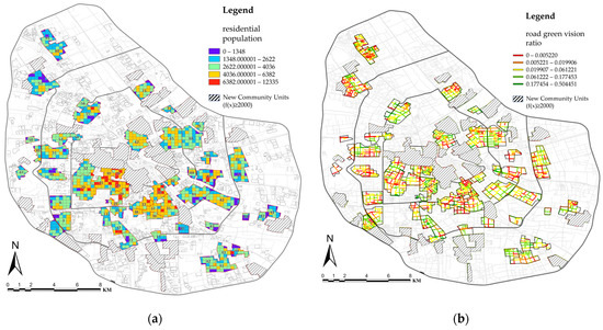 For calculating the indicator values for each unit, this study processed the basic data according to the scope of 57 community regeneration units. As shown in Figure 5a, this study used ArcGIS Pro software to project raster data into 57 community regeneration units and cut the raster at the unit boundaries. In the raster cut at the boundary, absolute value-type data such as the population is subtracted according to the proportion of the cut area. Proportion-type data, such as the proportion of high-income people, use the original raster data to avoid data errors due to raster cutting in subsequent calculations. On this basis, absolute value data of the community unit are obtained by adding the raster data within the unit. P3, P4, P5, and P6 indicator values are calculated based on the absolute value type of population portrait data and unit area. P7, P8, and P9 indicator values are based on the proportion type of population portrait data, which are weighted average results calculated from the original proportion data of the rasters in the unit with the residential population as the weight. The N2, N4, N7, and N8 indicator values are based on SVI semantic segmentation data, with road length as the weight, and calculate the weighted average result of the visual proportion of all road segments in the unit. An example of the green-looking ratio is shown in Figure 5b.