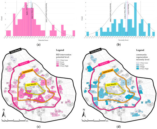 The potential and necessity scores of 57 community regeneration units are statistically distributed according to the standard normal distribution as shown in Figure 7a,b. For potential and necessity scores, the average value is 0.4504 and 0.3612, and the standard deviation is 0.1031 and 0.0889, respectively. This paper uses the average value and positive and negative standard deviations of potential and necessity scores to divide the 57 community regeneration units into four levels separately. The spatial distribution of community regeneration units with different levels of potential and necessity is shown in Figure 7c,d.