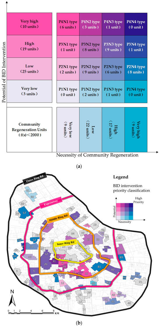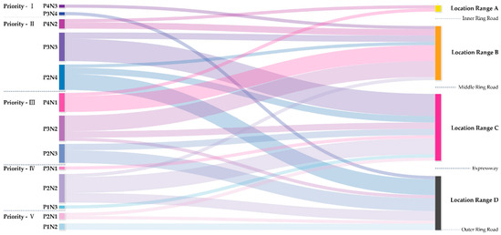 According to the principle that the higher the level of potential and necessity, the higher the priority of BID intervention, this study divided community regeneration units into five priority levels. Priority—I is the highest level, including P4N3 type unit 31 and P3N4 type unit 49. The Sankey diagram in Figure 9 and Table 6 shows the distribution of different types of community regeneration units grouped by priority level in urban location ranges. From the perspective of unit type distribution, the “P4-” and “P3-” types of units with higher potential levels are mainly concentrated within the middle ring road. On the contrary, the “-N4” and “-N3” types of units with higher necessity levels are mainly distributed outside the middle ring road.