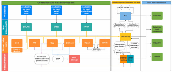 H2RES is a long-term energy modelling tool that employs a model based on long-term linear optimisation [28,33]. This model combines sector coupling solutions with high temporal resolution, operating on an hourly basis, encompassing several technologies.