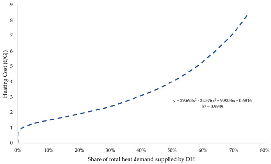 In Ref. [35], a cost curve for DH grid has been developed, taking into account climatic region, population density and the constraints of urban planning and the built environment. Such a curve has previously been employed in other research and is illustrated in Figure 3. Moreover, the cost of DH substations has been considered in accordance with Ref. [40].