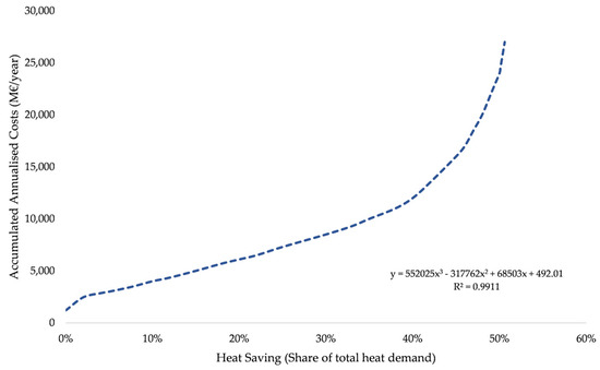 In order to assess the costs of energy savings, the cost curve of energy efficiency measures for the Italian building stock, developed in the context of the Heat Roadmap Europe, has been considered [36,41]. The curve is depicted in Figure 4.