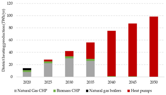 The DH has indeed faced a reduction in temperatures as the generations have passed. The transition from third- to fourth-generation DH has lowered the supply temperature from around 100 °C to 50–60 °C [15]. This reduces heat losses, improves energy efficiency and allows for the integration of centralised HPs and thus the use of renewable electricity generation to supply the DH demand [16].