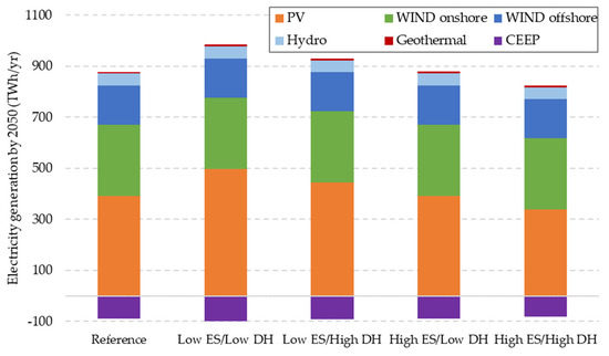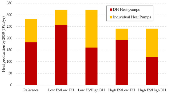 The Low ES scenario concerns the implementation of energy-saving measures with the objective of achieving a 20% reduction in demand by 2050. Conversely, the High DH scenario entails a 40% reduction in heat demand in the building stock by 2050. The reference scenario assumes an average value of 30% for the same target year.