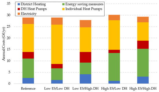 In Ref. [32], Connolly et al. analysed the combined impact of DH implementation and the energy-saving (ES) measures. According to them, in order to accurately assess the true impact of energy savings and efficient heat supply, it is essential to consider these factors in a combined manner, taking into account the mutual effects.