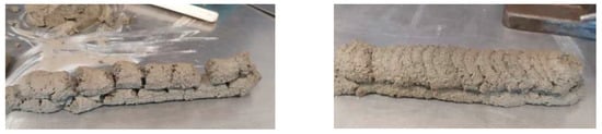 The problem sets in the initial days, when the powdered plasticizer probably limits the hydration of the mixture, which manifests itself in a “rubbery” and stickier structure of the samples and low strength characteristics. In the case of a 3D-extruded element, this could be a positive feature as the adhesion of the individual layers would increase. It is questionable to what extent the lower layers could withstand the load from the layers above them in the first days of ripening.
