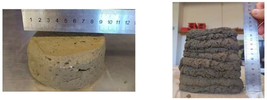 For illustration, in Figure 1, it is possible to see individual typical aspects of the development of a concrete mixture for additive technologies from the point of view of materials engineering, including the possibility of printing individual layers on top of each other, the height of the printing layer, the workability time, the visual aspects of the concrete mixture, and the mechanical properties with regard to workability. Figure 1 illustrates the initial phase of the author’s research work in the development of the mixture in the laboratory.