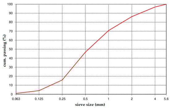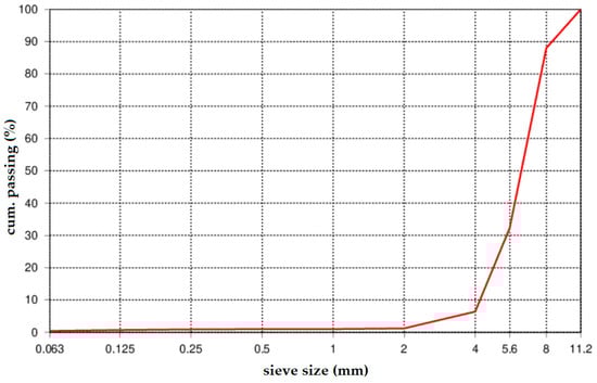 At the same time, during the selection of raw materials for the concrete mixture, a study of the individual components of the recipe was carried out. In the case of the Tovacov aggregate (0–4 mm) and the Litice aggregate (4–8 mm), a classic Particle Size Distribution (PSD) using test sieves was performed. In both cases, the aggregate suppliers declare their suitability for use in concrete mixtures. The test results are depicted in Figure 2 and Figure 3.
