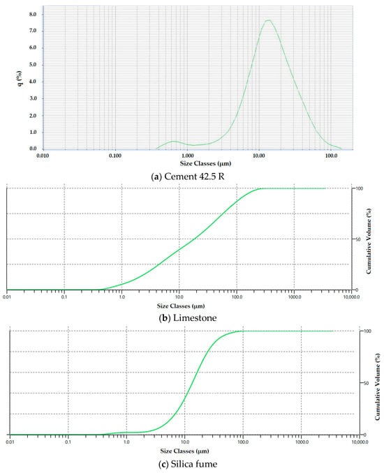 Particle size analysis. (a) Cement 42.5—q (%); (b) limestone—cumulative volume (%); (c) silica fume—cumulative volume (%).