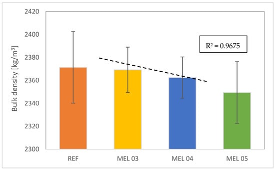 From the bar chart in Figure 6, it is obvious that the samples from the reference mixture achieved the highest bulk densities. The average bulk density values of the mixtures containing the powdered plasticizer decreased almost directly proportionally (coefficient of determination R2 = 96.75%) with an increasing dosage of the mentioned plasticizer. With an increasing content of the powdered plasticizer, the air content increased, resulting in an almost linear decrease in bulk density. This was evident in the number of pores present in the samples of the individual mixtures.