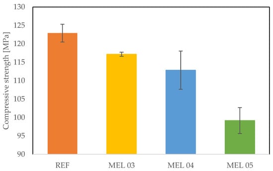 - The highest cube compressive strength after 28 days was achieved for the MEL 03 mixture at 121.6 MPa, and the lowest was achieved for the MEL 05 mixture at 102.8 MPa. The highest tensile splitting strength was achieved for the REF mixture at 6.91 MPa, and the lowest was achieved for the MEL 05 mixture at 5.99 MPa.