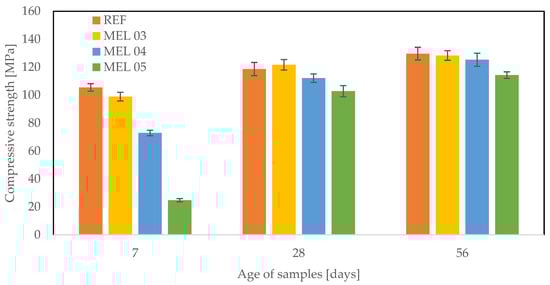 As shown in Figure 7 and Figure 8, the average compressive strength decreases with an increasing content of the powdered plasticizer compared to the reference mixture with liquid plasticizers. The MEL 03 mixture is the closest to the reference mixture in terms of compressive strength. In Figure 8, there is also a clear change in compressive strength over time, depending on the dosage of the powdered plasticizer. In the case of the MEL 05 mixture, a significantly lower 7-day compressive strength (approx. 25 MPa) was observed compared to the other mixtures. It is necessary to mention that an increased amount of powdered plasticizer has a negative effect on the maturation of the mixtures, which is reflected by a lower increase in initial compressive strength in the first 7 days. After the standard period of 28 days, the strength characteristics increase and stabilize.