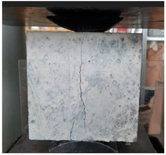 Tensile splitting strength was tested in accordance with the ČSN EN 12390-6 standard [] on six concrete cube samples with an edge length of 150 mm. The test specimens were positioned (see Figure 9) so that the jaws of the press acted perpendicular to the direction of filling. The loading rate of the specimens was 0.04–0.06 MPa/s until failure occurred. Based on the achieved maximum load force, the tensile splitting strength was subsequently determined according to the relevant standard [].