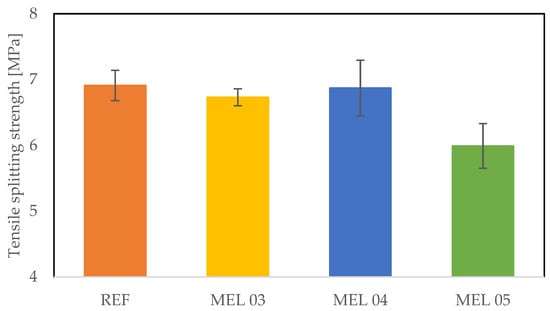 From Figure 10, it can be concluded, once again, that with an increasing content of the powdered plasticizer, the tensile splitting strength decreases. In this case, the average value of the observed tensile splitting strength of the MEL 04 mixture (6.87 MPa) exceeded that of the MEL 03 mixture (6.73 MPa) and approached that of the reference mixture (6.91 MPa). This is likely due to the high variability in the values of tensile splitting strength obtained during the test. The values of the REF, MEL 03, and MEL 04 mixtures are relatively similar; thus, it is clear that the critical amount of powdered plasticizer that affects mechanical properties ranges from 5% upwards.
