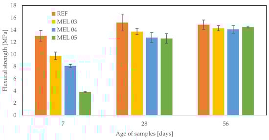 Flexural strength was tested on beam samples with dimensions of 40 × 40 × 160 mm within an interval of 7–56 days. Similar to compressive strength, the flexural strength of the reference mixture reached a high initial value (13 MPa), while the MEL 05 mixture achieved the lowest (3.8 MPa). However, after 56 days, all mixtures became relatively stabilized and reached values within the range of 14.1–14.9 MPa. For this test, as well as for the tensile splitting strength test, reinforced samples would be more relevant.