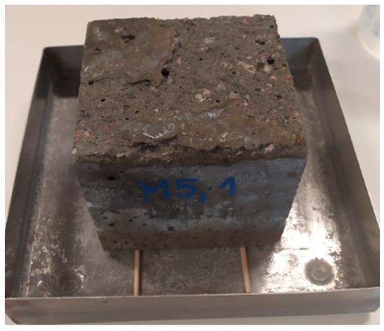 Resistance to water and defrosting chemicals was tested with deviations from the ČSN 73 1326 standard []. One difference lied in the arrangement of the test specimens (with an edge length of 100 mm) so that the surface in contact with the salt solution was also in contact with the bottom of the testing dish. This measure was implemented because of the segregated layer created on the surface of some mixtures containing the powdered plasticizer. In Figure 12, a cube of the MEL 05 mixture for example from experimental program. Another difference was the number of cycles, which increased due to the higher expected resistance to water and defrosting chemicals.