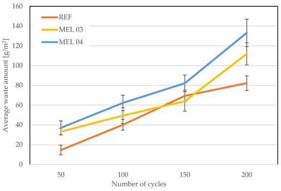 The graphical visualization of total waste amount after a number of individual cycles for the REF, MEL 03, and MEL 04 mixtures is presented in Figure 13, while the visualization for the MEL 05 mixture is shown in Figure 14. This was performed to obtain a clearer picture of the results influenced by the comparatively higher waste values of the MEL 05 mixture. The waste values with their corresponding statistical characteristics are displayed in Figure 13 and Figure 14.