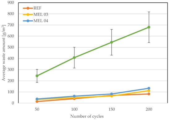 Comparison of overall average waste after a number of individual cycles for the REF, MEL 03, and MEL 04 mixtures.