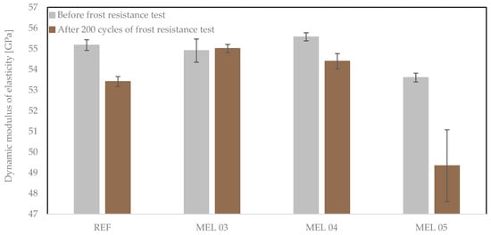 Comparison of the dynamic modulus of elasticity before and after the frost resistance test.