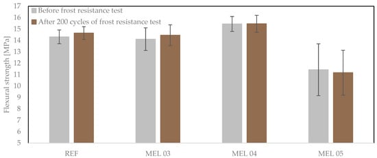 The values in the graphs in Figure 16 show that the compressive and flexural strengths do not differ significantly from each other. Greater differences could be observed in the case of the REF and MEL 03 mixtures, which achieved slightly higher flexural strength values after frost resistance testing compared to the samples not subjected to this test. As for the MEL 05 mixture, there was a slight decrease in flexural strength after frost resistance testing (with significantly higher value dispersion in both cases). In any case, it seems that frost does not have such a significant destructive effect on high-quality concrete, and all mixtures are frost-resistant after 200 cycles according to the standard [].