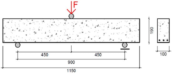 For the purpose of load-bearing testing, two reinforced concrete beams were created, each with a length of 1150 mm and a cross-section of 100 × 190 mm, with one beam made from the reference mixture and the other from the MEL 04 mixture. The span during loading was 900 mm. During concreting, both beams were reinforced with a steel rebar reinforcement of 3 × Ф 10 mm. The loading scheme is illustrated in Figure 17. The corresponding photographic documentation of the testing process is shown in Figure 18.