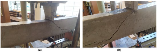 Photos of the shear crack after the load-bearing capacity test of reinforced concrete beams made from the (a) REF and (b) MEL 04 mixtures.