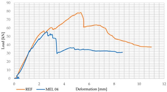 As shown in Figure 18, both beams exhibit shear cracks. In the case of the beam made from the MEL 04 mixture, the crack developed only on one side, whereas in the case of the beam made from the reference mixture, cracks appeared on both sides. No tensile cracks were developed in either case. The beam made from the reference mixture achieved the highest load-bearing capacity, reaching 78.5 kN, while the beam made from the MEL 04 mixture reached a maximum load-bearing capacity of 55 kN. The level of deformation was irrelevant in this case, as the loading was terminated without failure of the steel reinforcement. The loading process was also captured and evaluated in the form of a graph shown in Figure 19.