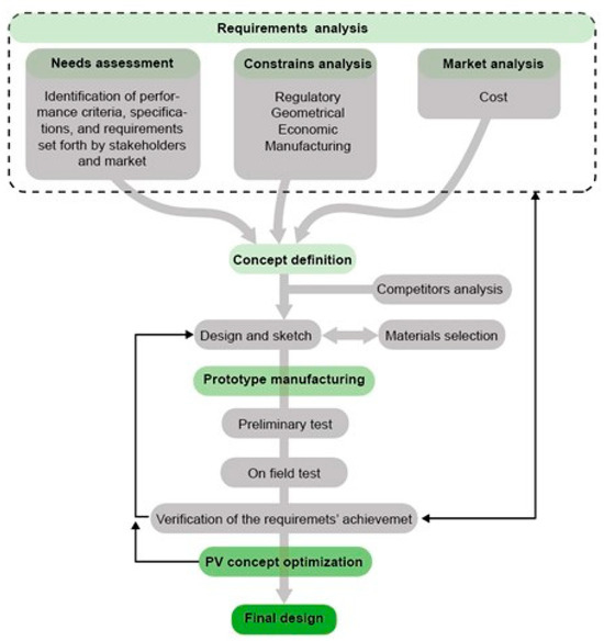 | Geometrical | Compatibility with traditional tiles | PV tiles must easily substitute for the main types of traditional tiles, thus having the same width (~40 cm) and overlapping application. |