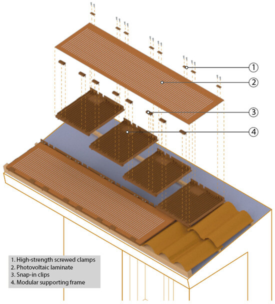 - Solutions based on photovoltaic modules. Various aluminum framings were developed to allow laminates of different types (usually having a size similar to that of traditional PV modules) to be hooked onto the roof structure, ensuring waterproofing, thanks to systems that allow the overlapping of modules and/or sealing of gaps between modules with seals or special profiles. In many cases, the installation does not provide the stepped roof tile effect or, in options where this is the case, the significantly larger module size does not allow for a similar effect to that of traditional roof tiles. Thermal insulation and back ventilation must be typically ensured by layers/technical solutions independent of the PV modules.As reported in Table 1, some products are characterized by a medium size, generally with a width similar to that of existing clay tiles and a longer length in order to increase the integrability in existing roofs while containing the cost. However, such components are generally too stiff and fail to absorb the unevenness/irregularities typical of existing roofs.