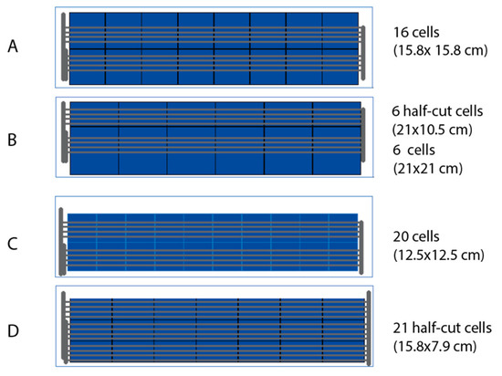 | Cell configuration | C—20 cells (12.5 × 12.5 cm) | C—20 cells (12.5 × 12.5 cm) | D—21 half-cut cells (15.8 × 7.9 cm) |