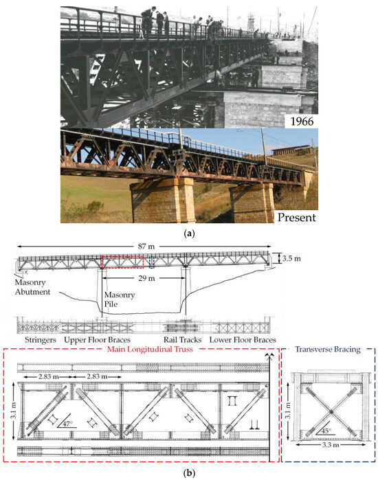 (a) View of the investigated riveted truss bridge at launch and present time; (b) main geometrical features as retrieved from the original design drawings.