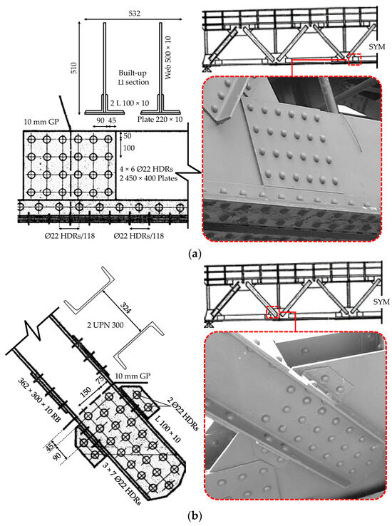 Riveted connections represent the most common structural detail implemented in steel bridges erected in the XIXth century and the first half of the XXth century [1,2,3]. Hot-driven rivets (HDRs) were usually adopted to either couple hot-rolled members into built-up sections—that is, by means of riveted battens—or to assemble truss nodes with a high density of rivets resisting to shear. These recurring practices had their roots in previous, empirical knowledge gained from timber structures [4,5,6].