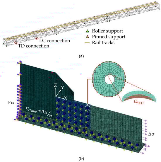 Local FEMs for SED calculations were developed in ABAQUS v6.14 [34] (see Figure 3b,c). As anticipated, LC and TD connections were selected owing to (i) non-negligible mean tensile stresses due to gravity loads and (ii) significant stress histories due to train loads. In order to enable SED calculations, all parts were discretized by means of C3D20R elements (20-node solid brick, reduced integration, quadratic geometry as suggested in [19,35,36]).