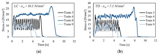 Nevertheless, while equivalent mean stresses σm,eq—estimated by adding σm and the average stress σm,i associated with the i-th rainflow rehearsal—were higher in LC compared with TD, the highest values of stress ratio R are actually reached in the latter member (Rmax = 0.91, Train 8), due to the larger (relative) impact of mean stresses with respect to the endured stress ranges.