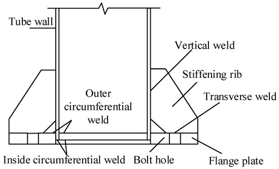 Steel tube structure has the advantages of a large radius of gyration of cross-section and a small wind resistance coefficient [1]. It is used by designers in large-span structures such as ultra-high-voltage transmission towers and terminal buildings. The flange joint is one of the most commonly used connection types for steel tube structures. The flange joint has the advantages of explicit mechanical properties, simple construction, less maintenance, and easy installation and demolition. Steel tube flange joints can be divided into two types: flexible flange and rigid flange [2]. Compared to a joint with a flexible flange, the joint with a rigid flange has a circle of ribs welded at the connection of the flange plate and tube end, lending the joint more rigidity and strength, as shown in Figure 1. The two flanges are connected through the bolt. In a steel tube transmission tower, the steel consumption of the flange joints is so high that it needs to be carefully designed to reduce the costs of the overall structure. However, the current calculation theories and design methods of the flange joint are imperfect, making the effects of some design parameters on mechanical behavior unclear. Therefore, it is significant for the safety and cost reduction of steel tube structures to investigate the mechanical performance and propose more reasonable design methods.