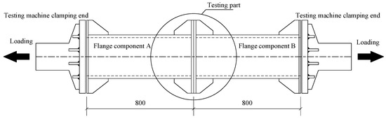 In this paper, 11 groups of flange joint specimens are tested, with three identical samples in each group. As shown in Figure 2, the testing part of each flange joint specimen is formed by flange component A and flange component B. The length of the specimen is 1600 mm. The experiment was conducted in the structural testing laboratory at Beijing Jiaotong University. The flange specimens were installed in the laboratory (Figure 3a), and then placed onto a horizontal tensile testing machine for loading (Figure 3b).