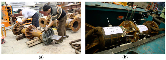 Installation and arrangement of flange. (a) On-site installation of flange specimen; (b) flange in place on the testing machine.