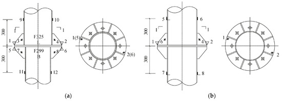 Figure 4a (left), is applied to FL1 to FL3. It consists of 12 strain measuring points arranged in symmetrical positions on the specimen to observe tubes with different diameters. Due to the complex stress of the flange and the installation of strain gauges being blocked by the ribs and bolts, the strain-measuring points are arranged on the outer edge of the flange plate near the weld of the ribs (points 1, 2, 5, 6). The strain-gauge-measuring points on the stiffening rib (points 3, 4, 7, 8) are arranged at the height of 1/2 of the stiffening rib plate near the steel tube. Two pairs of measuring points (points 9, 10, 11, 12) are symmetrically arranged in the middle of the flange steel tube to measure the stress characteristics of the steel tube. Figure 4b (left), is applied from FL4 to FL11, which are composed of the same flange components. There are eight measuring points in Figure 4b. As shown in Figure 5, the measuring points on the flange plate and stiffening rib plate are only arranged on one side of the flange.