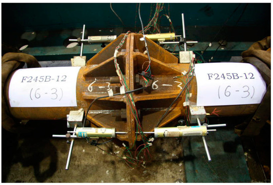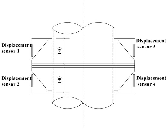 Flange plate deformation is measured by four displacement sensors near the weld at the outer edge of the flange plate, as shown in Figure 6 and Figure 7. Due to the unavoidable eccentric loading during the testing, taking the average value of the two pairs of displacement sensors on both sides of the centerline can effectively eliminate errors.