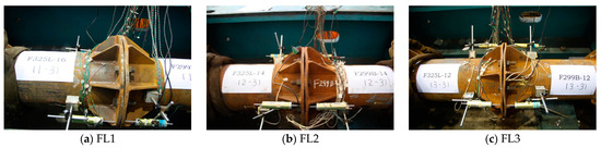 In group FL1 (shown in Figure 8a), FL1-2 did not reach the complete failure stage due to the malfunction of the loading machine, making the deformation not obvious. FL1-1 and FL1-3 showed the first failure mode. The flange plate deformation of the thinner tube (F299B) was more significant than that of the other tube (F325L).