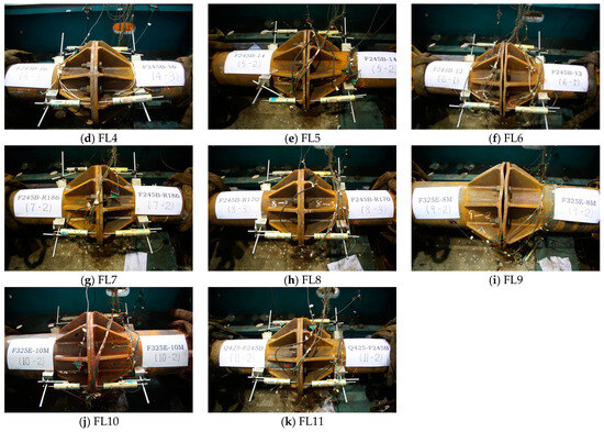 In group FL9 (shown in Figure 8i), the specimens showed the first failure mode, in which the flange plates deform significantly.