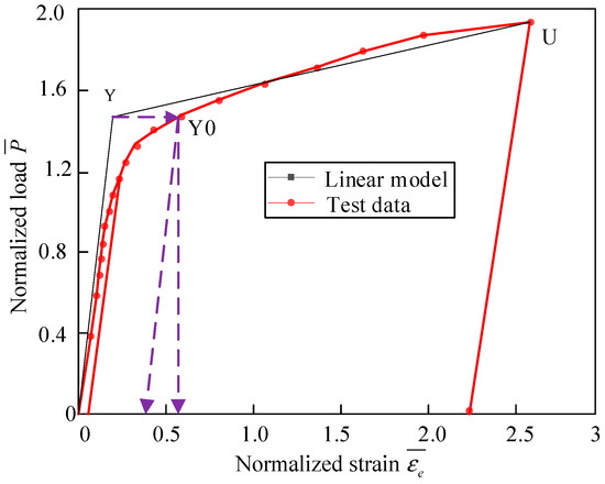 where is the normalized Mises strain; εe is the Mises strain of the steel; and εy is the yield strain of the steel. When , it can be concluded that the specimen yields. Similarly, the test load P is normalized: