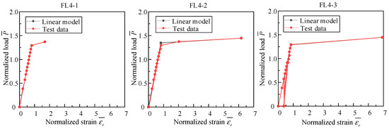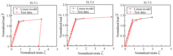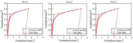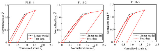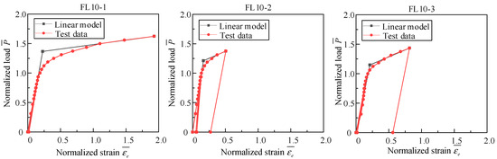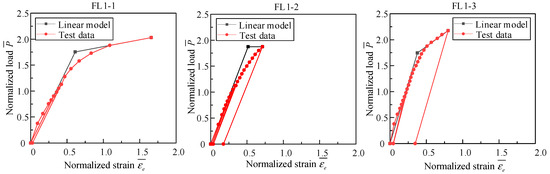 A straight line is drawn parallel to the X axis from point Y, and the intersection Y0 with the actual loading curve is defined as the actual yield point. Then, straight lines are drawn parallel to the Y coordinate axis and O-Y, and the yield strain and residual strain are obtained, which are 0.59 and 0.38, respectively. In this way, the bilinear model curves of each specimen can be obtained, as shown in Figure 10, Figure 11, Figure 12, Figure 13, Figure 14, Figure 15, Figure 16, Figure 17, Figure 18, Figure 19 and Figure 20. The actual bearing capacity of each specimen is listed in Table 6.