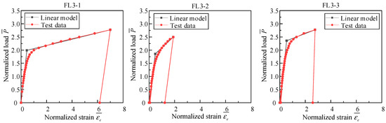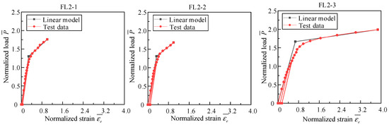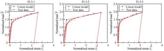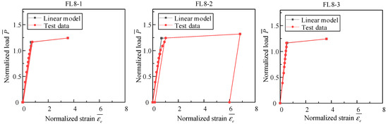 Taking the specimens of FL5 group as an example, firstly, the average value of the measurement results at strain measuring points 1 and 2 is taken as the Mises strain of the outer edge of the flange plate. Then, it is specified to obtain the , while P is specified to obtain the .