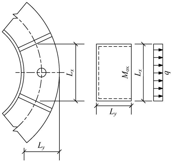 The flange plate is divided into n equal parts by the ribs. Each part can be approximately regarded as a rectangular plate with three sides simply supported and one side free, with a size of Lx × Ly. Assuming that the tension borne by the bolt is evenly distributed to the rectangular plate, the uniformly distributed load on the rectangular plate can be calculated according to the following formula: